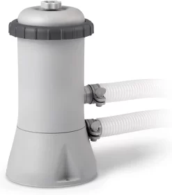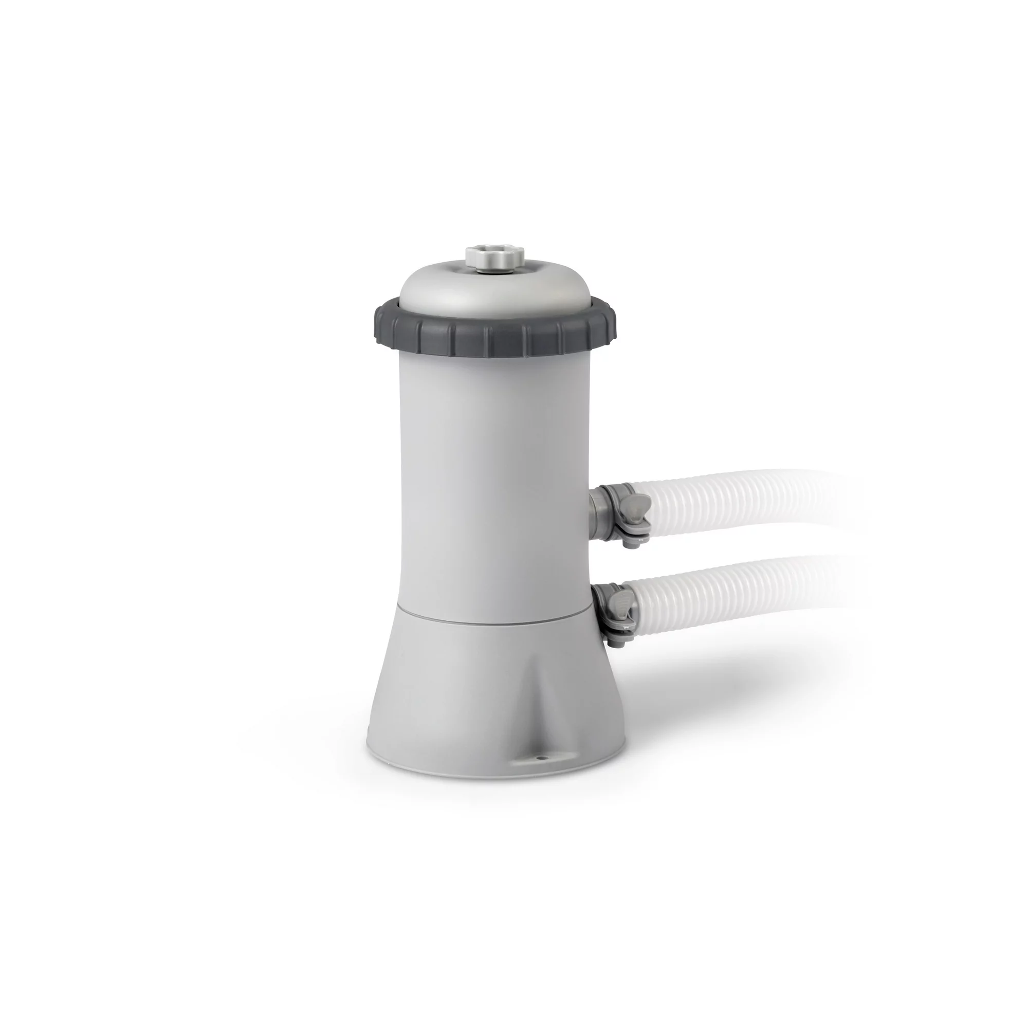 Enjoy summer outdoor fun with the Intex Prism Pool enhanced with strong powder coated metal frame and durable 3ply material liner. Beautifully designed the soft gray exterior and the elegant blue tile print interior provide an upscale look to complement modern backyard decor and furniture Hydro Aeration Technology is incorporated into the pump for improved circulation and filtration improved water clarity and increased negative ions at the water surface. The pool is constructed with puncture resistant 3 ply material and innovative new T Joint Assembly is easy no tools required. The set includes a 530 gal cartridge filter pump and is ready for water in approximately 30 mins. The water capacity is 1718 gallons Suitable for ages 6 years and up
