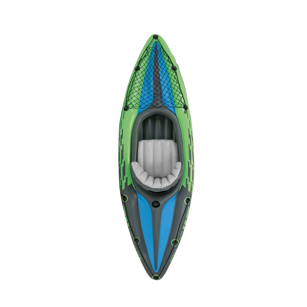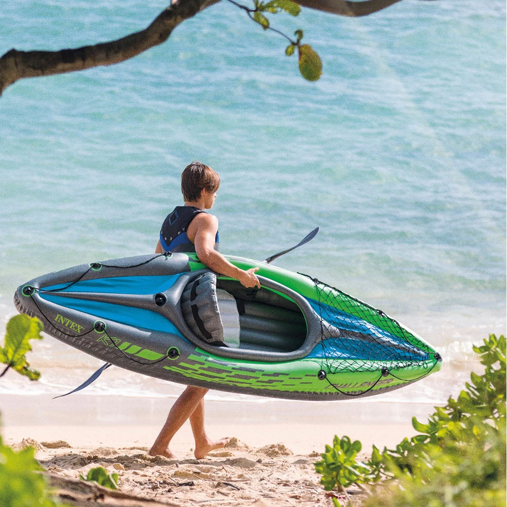 The Intex Challenger K1 Inflatable Kayak is a lightweight and compact kayak suitable for one person. It features a durable vinyl construction with welded seams for enhanced strength and reliability. The kayak comes with an inflatable I-beam floor for added stability and comfort during paddling. It includes an adjustable inflatable seat with a backrest for customized comfort. The kayak also features a cargo net for storing gear and belongings, as well as a grab line on both ends for easy carrying and handling. With its sleek design and easy setup, the Challenger K1 offers convenience and fun for solo paddling adventures on lakes, ponds, and mild rivers.