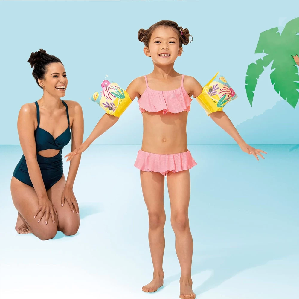 The Intex Deluxe Arm Bands are essential swimming aids for children who are learning to swim or gaining confidence in the water. These floaties offer buoyancy and support, helping young swimmers stay afloat and build their swimming skills.