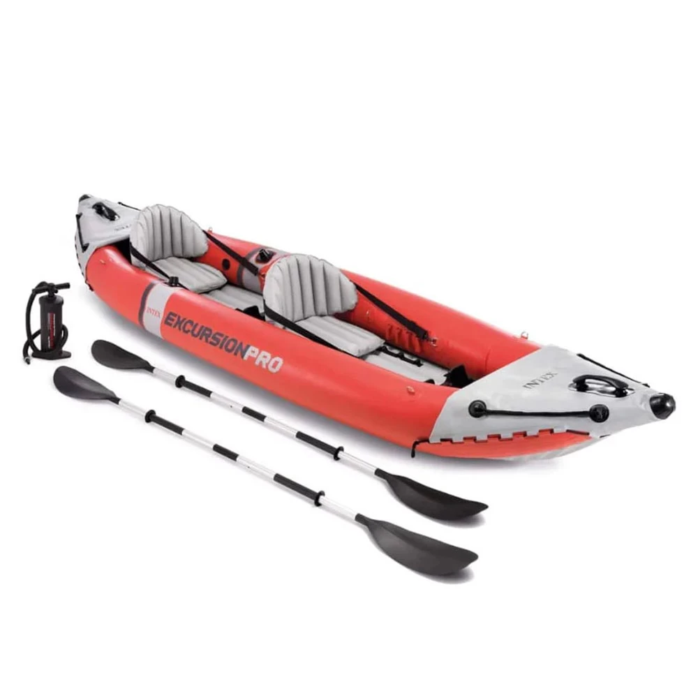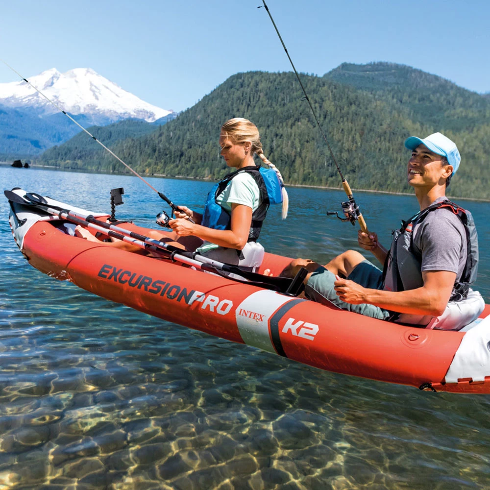 The Intex Excursion Pro K2 Inflatable Kayak is built for adventurous duos looking for durability, stability, and performance on the water. Constructed from super-tough laminate PVC with a polyester core, this kayak can handle rugged conditions and provide reliable buoyancy. It features adjustable and removable seats with backrests, allowing for customized comfort during long paddling sessions. The kayak includes two integrated footrests for improved paddling efficiency and comfort. Equipped with removable skegs, the Excursion Pro K2 offers enhanced tracking and stability in different water conditions. It also features adjustable mounting brackets for attaching accessories like fishing rod holders or GPS systems. With its high-pressure inflation capability and sleek design, this kayak ensures stability, maneuverability, and performance for tandem paddling adventures.