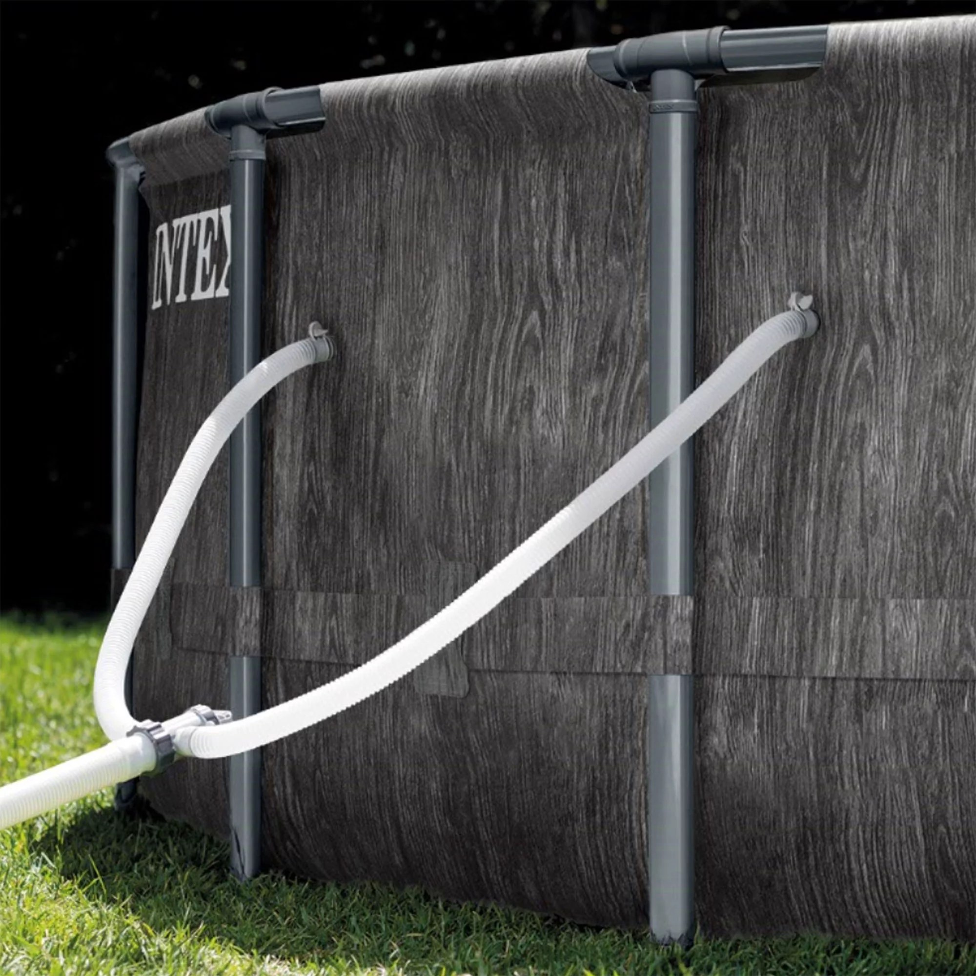 - Premium above-ground pool set with a sophisticated woodgrain exterior is an ideal addition to your backyard