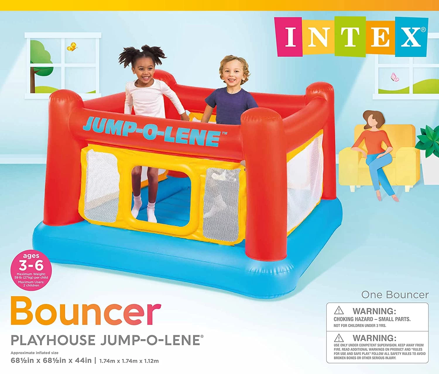 - Perfect for jumping and playing, the Intex Playhouse Jump-o-Lene is a great play gym for young kids to enjoy for hours on end.This colorful bouncer comes equipped with a crawl-thru door for kids to easily crawl inside
