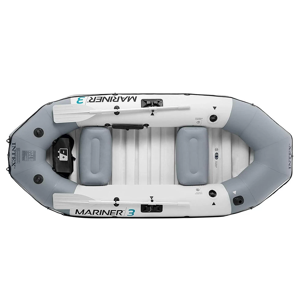 The Intex Mariner 3 Inflatable Boat Set is a durable and versatile option for families or small groups to enjoy leisurely outings on lakes, ponds, or slow-moving rivers. It features a heavy-duty puncture-resistant PVC construction with three air chambers, ensuring durability and safety on the water. The boat comes with three inflatable seats, providing ample space for passengers to sit comfortably during excursions. Additionally, it includes an inflatable keel for improved stability and tracking, as well as a high-output manual pump for quick and easy inflation. The boat is equipped with fishing rod holders, oar locks, and integrated grab handles for convenience. With its spacious design and sturdy construction, the Mariner 3 offers a reliable and enjoyable boating experience for groups.