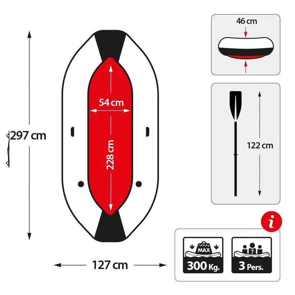 Features: Inflatable keel, three inflatable seats, fishing rod holders, oar locks, integrated grab handles, high-output manual pump