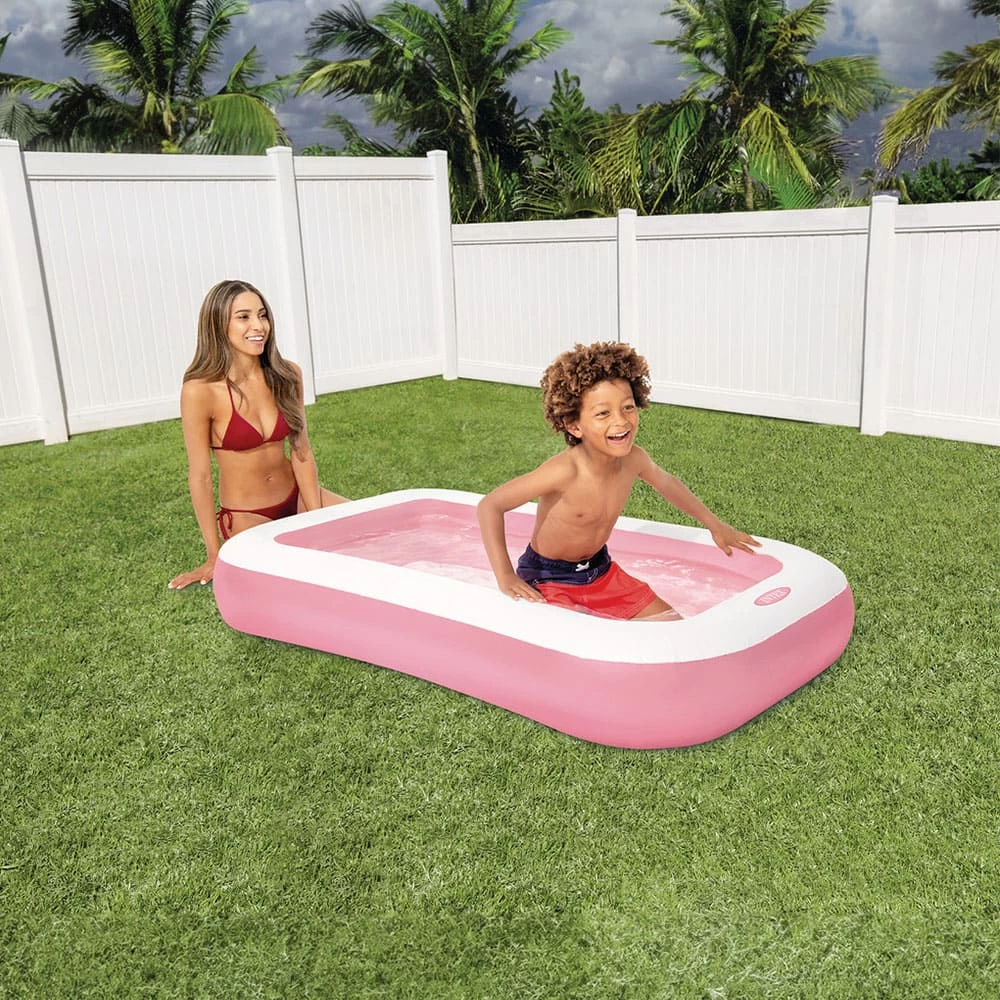 The Intex Pink Rectangular Inflatable Kiddie Pool is designed to offer young children a fun and refreshing water play experience. With its vibrant pink color and rectangular shape, this inflatable pool adds a splash of color and excitement to any backyard or outdoor play area. The pool’s compact size makes it suitable for smaller spaces, providing a convenient and entertaining way for children to cool off during hot summer days.