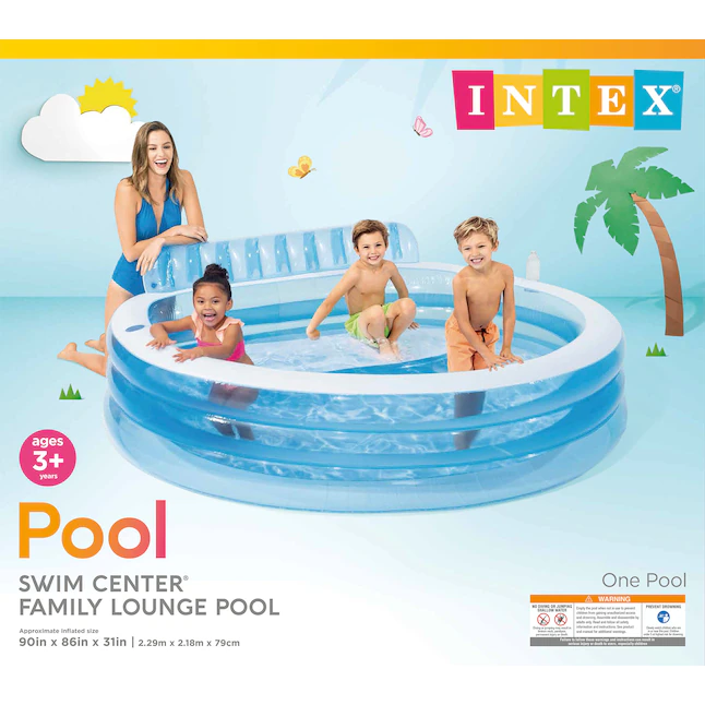 Take a splash in the Intex Swim Center Family Lounge Pool Remarkably easy to setup, the swim Center Family Lounge Pool requires simple quick inflation and is ready to fill with water and your little ones will be splashing and playing in minutes. Bring all the fun of the beach to your backyard and enjoy the colorful ocean graphics with the Add some color and style to your backyard with the Intex Swim Center Family Lounge Pool. Spend more time swimming in your pool this summer and less time cleaning it with the Intex 8 Foot Easy Set Pool Cover.